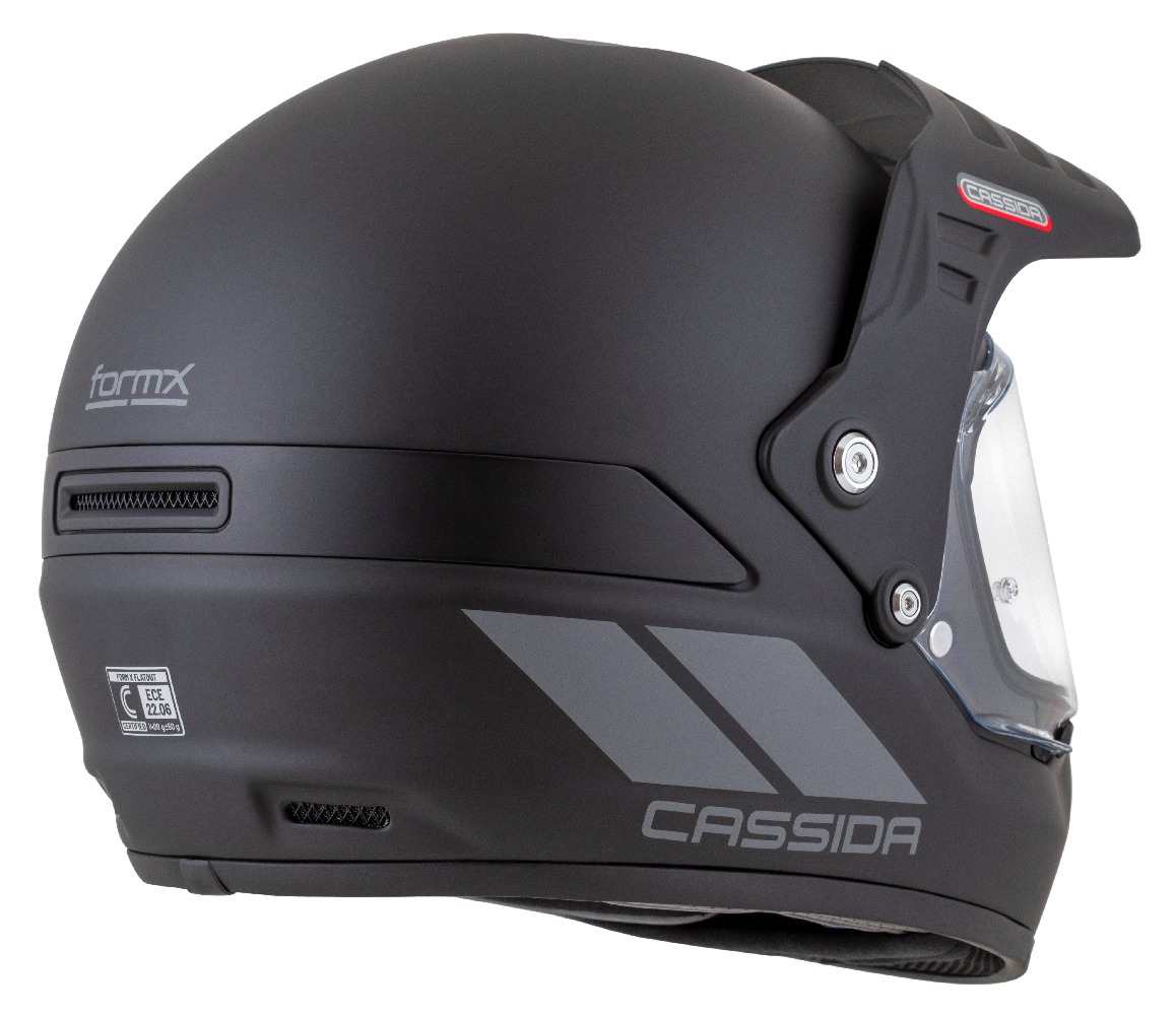 The FormX Helmet is a full-face helmet with a fiberglass shell and a removable peak. The ability to configure it either as a classic full-face helmet without the peak or with a peak and no visor makes it a highly versatile and stylish piece of protective gear.