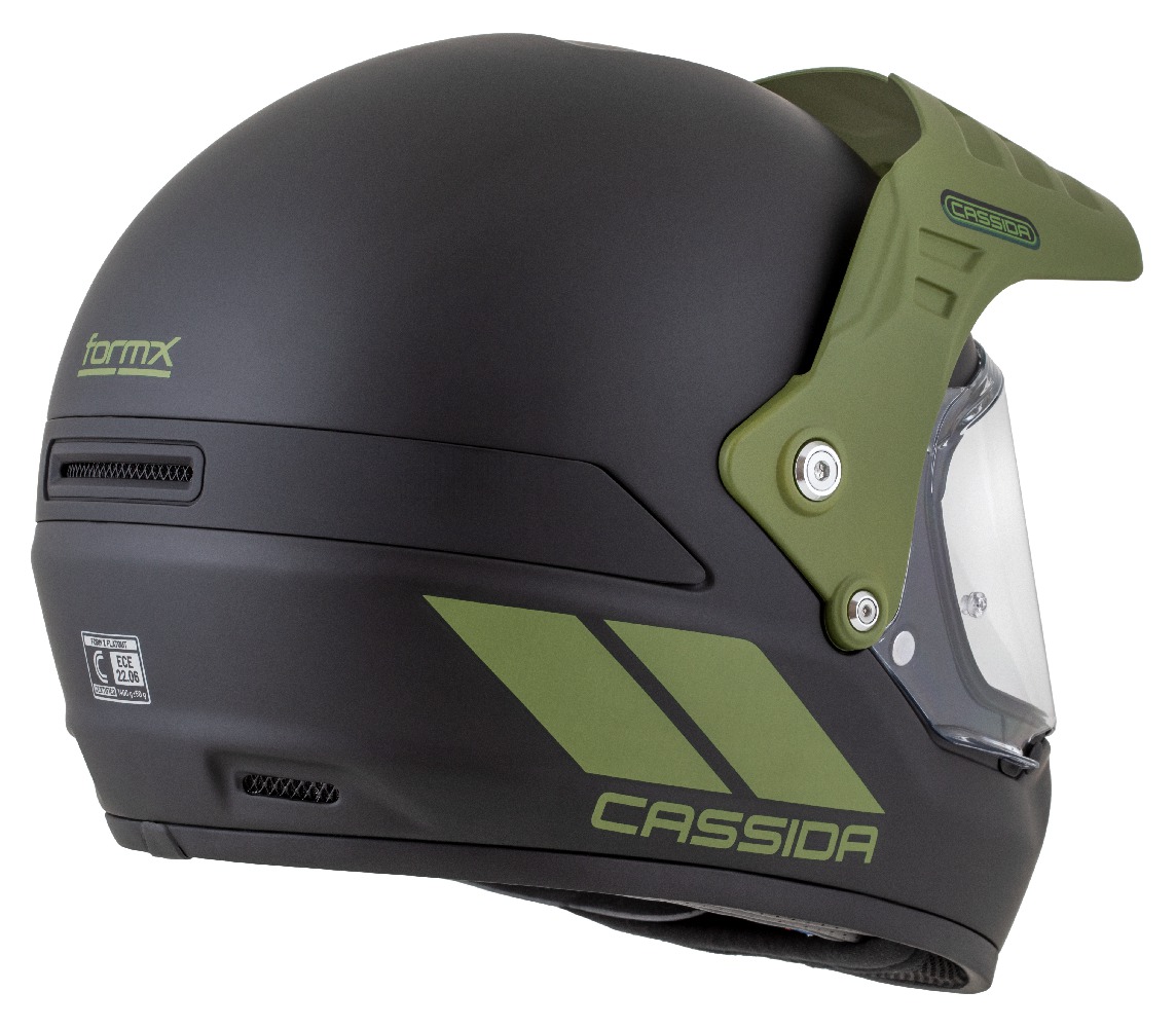 The FormX Helmet is a full-face helmet with a fiberglass shell and a removable peak. The ability to configure it either as a classic full-face helmet without the peak or with a peak and no visor makes it a highly versatile and stylish piece of protective gear.