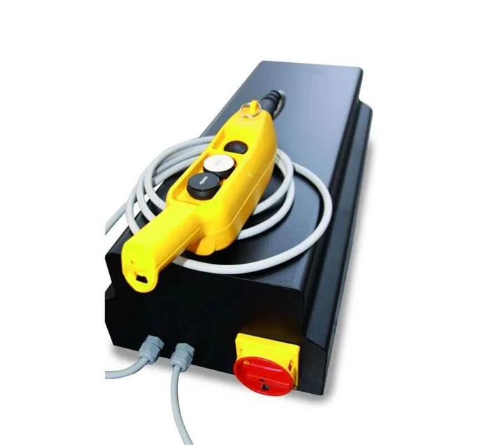 Our LV8 Goldrake motorcycle lifts are supplied with a control unit, integrated into the base, protected by a powder coated sheet-metal cabinet with interlocked safety switch and a button panel equipped with magnet.