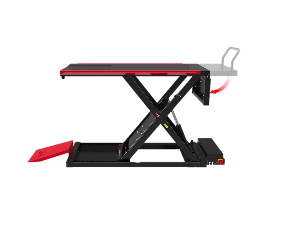 The Goldrake 800 Split motorcycle lift, designed and produced i LV8, is able to fully lift 800 kg up to a height of 130 cm. It is equipped with front split system for easy disassembly of wheels and suspensions.
