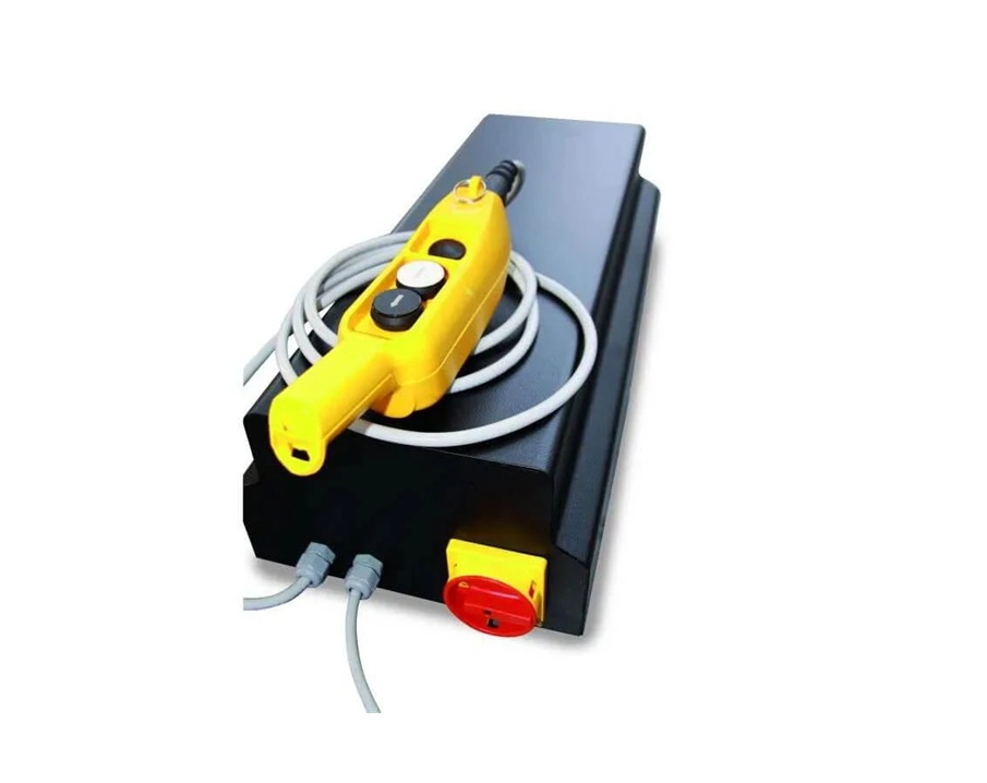 Our LV8 Goldrake motorcycle lifts are supplied with a control unit, integrated into the base, protected by a powder coated sheet-metal cabinet with interlocked safety switch and a button panel equipped with magnet.