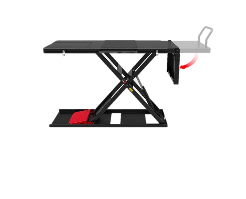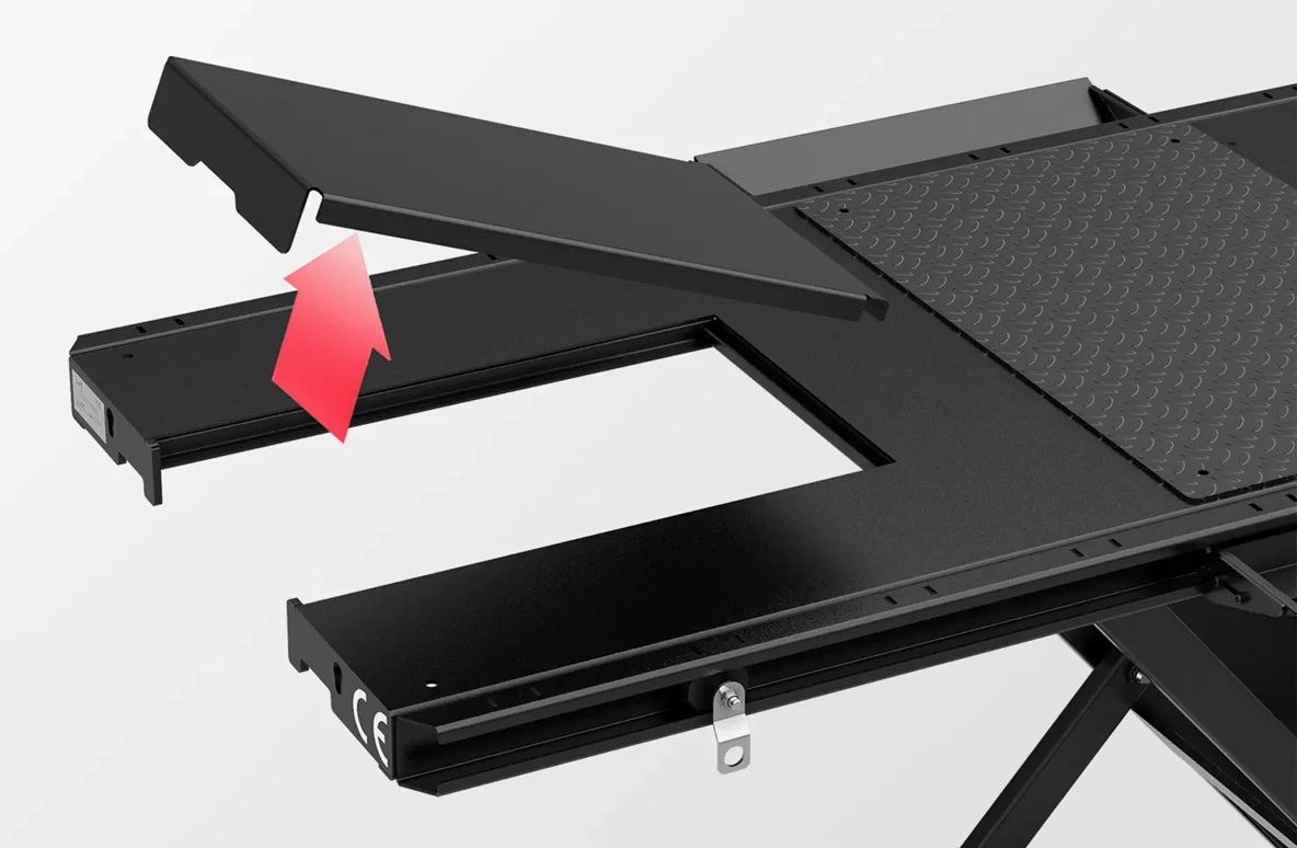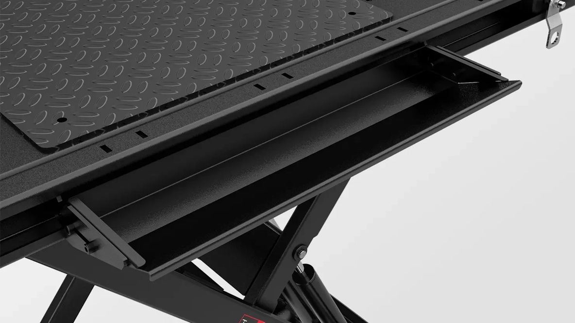 The Nano 600 Split is provided with tilting front split, removable gate, sliding tools holders kit, antiskid plate and sliding hooks for belts fastenings. Multifunctional accessories for a high-performance motorcycle lift.