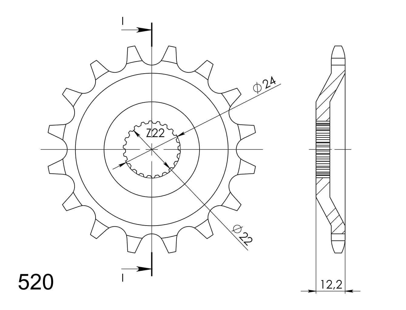 Stronger teeth for up to 10% longer chain kit lifetime. Front sprocket 15T, chain 520.