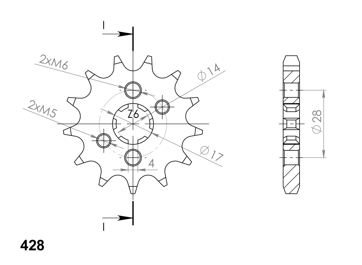 Stronger teeth for up to 10% longer chain kit lifetime. Front sprocket 14T, chain 428.