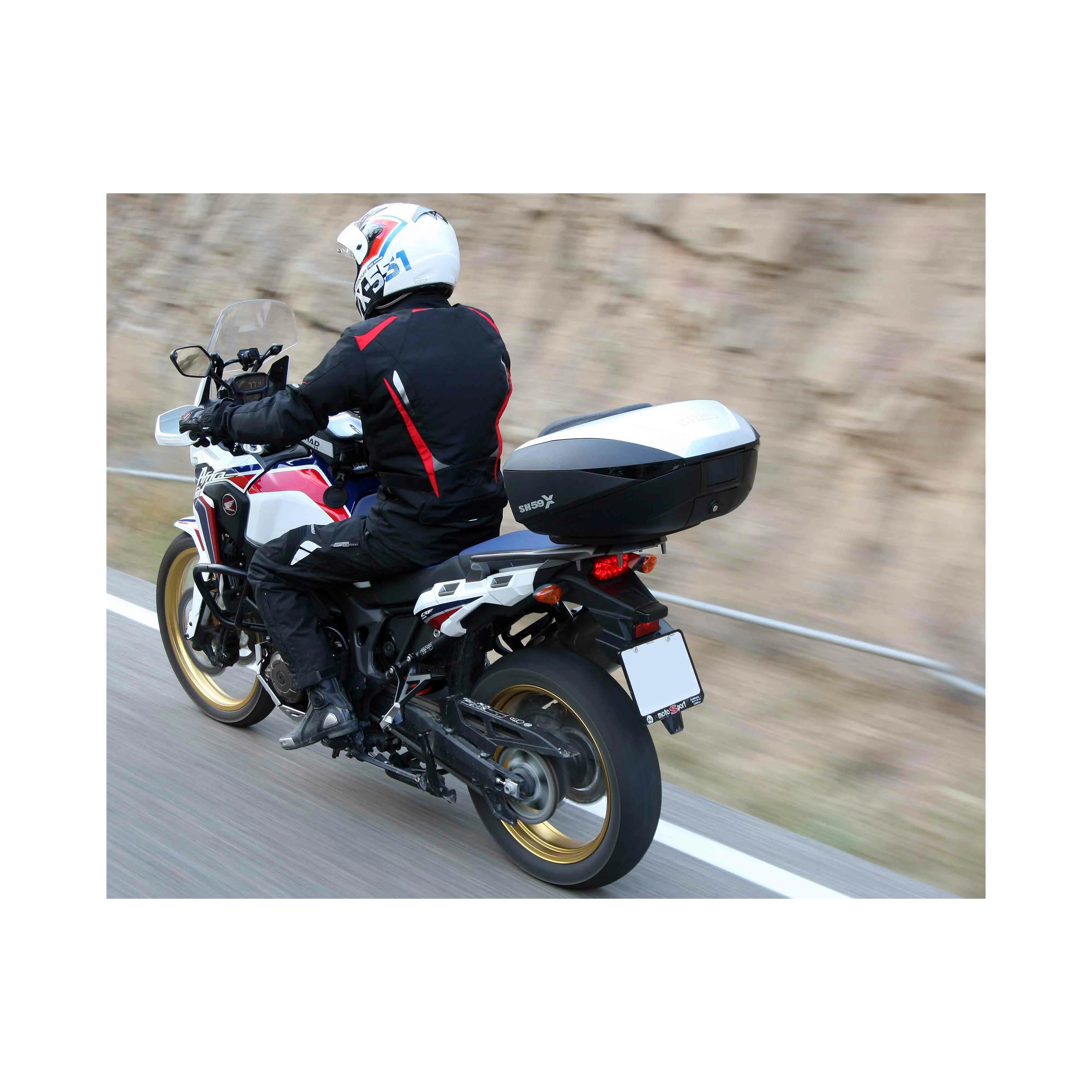 The SH59X is a motorcycle top case unique in the market. Its innovative design allows its loading volume to be regulated in up to 3 different positions in a matter of seconds (46, 52 and 59 litres), which allows to carry 2 enduro helmets without having to put them to the side, plus travel accessories. It also has internal holding straps to ensure that the load doesn’t move.